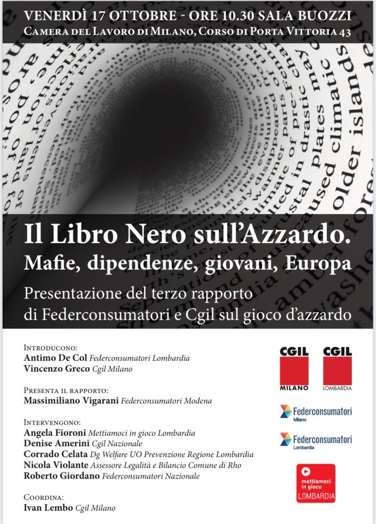 Presentazione del terzo rapporto di Federconsumatori e CGIL sul gioco d’azzardo. Venerdì 17 ottobre alle ore 10.30 presso la Camera del Lavoro Metropolitana di Milano Sala Buozzi si svolgerà il convegno “Il libro nero sull’azzardo. Mafie, dipendenze, giovani, Europa”. […]